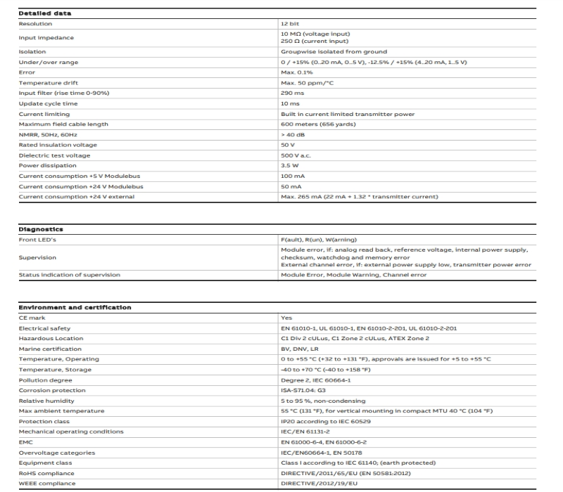 مشخصات فنی برای ماژول ورودی آنالوگ AI815 3BSE052604R1 شامل موارد زیر است: